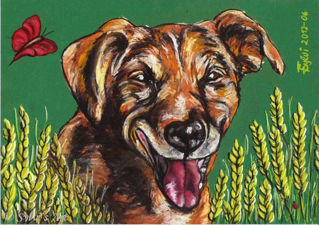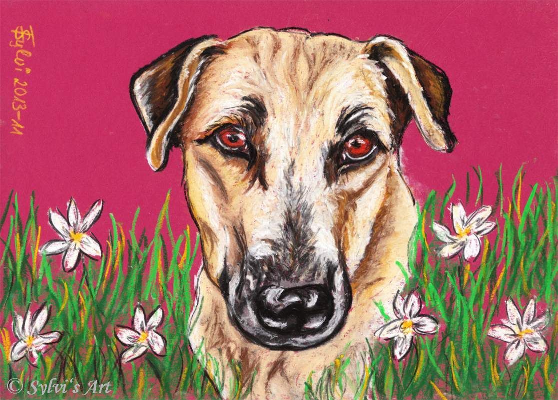 Zum Bildmotiv: Im Oktober 2009 ging es Toby sehr schlecht - wir mussten das Schlimmste befürchten. Mit dem Bild wollte ich mich zum einen ablenkden und zum anderen ihn so portratieren, wie es seinem Wesen am ehesten nahe kam - sanft und friedlich, auf einer saftig grünen Wiese mit allerlei bunten Blumen und summenden Insekten. Also im Grunde sah ich ihn damals schon im Regenbogenland... Dies Bild ist eines meiner liebsten Erinnerungsstücke an den besten Hund der Welt.